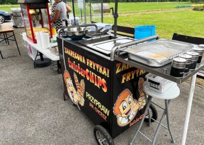 Przygotowujemy nasze zakręcone ziemniaki na miejscu, na oczach gości, co dodaje całemu procesowi wyjątkowego charakteru i pozwala cieszyć się świeżością produktu. Zaczynamy od całego ziemniaka, który specjalnym urządzeniem kroimy w cienkie, spiralne plastry, a następnie smażymy na głębokiej fryturze do momentu, aż osiągną złocisty kolor i idealną chrupkość. Serwujemy je na patyku, co sprawia, że są nie tylko smaczne, ale również wygodne do jedzenia podczas spaceru po festynie czy innym wydarzeniu.